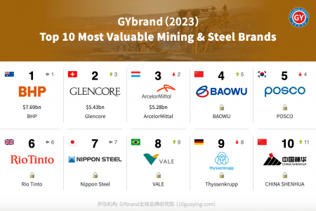 从GYbrand发布2023年度全球最具价值采矿和钢铁品牌排行榜前十名单来看,必和必拓高居榜首,嘉能可赶超安赛乐米塔尔升至第二,宝武集团排名第4,中国神华排名第十。