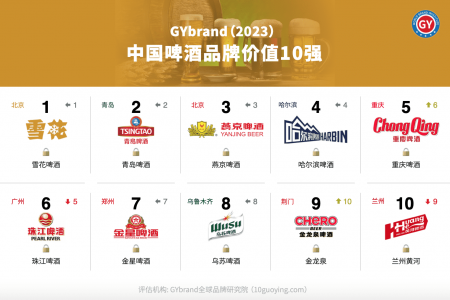 GYbrand最新中国啤酒品牌价值10强排名:雪花、青岛啤酒、燕京、哈啤、重庆啤酒、珠江、金星、乌苏、金龙泉、兰州黄河。青岛啤酒缩小与榜首的差距,明年有望登顶。