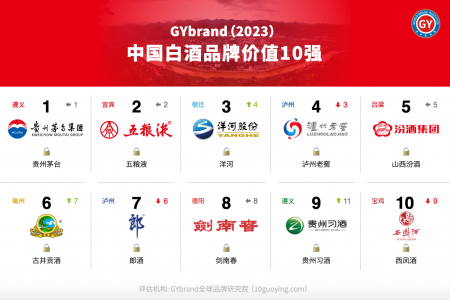 GYbrand发布2023年中国十大白酒品牌价值最新排名:贵州茅台、五粮液、洋河、泸州老窖、山西汾酒、古井贡酒、郎酒、剑南春、贵州习酒、西凤酒。
