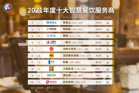 过硬金榜2021十大餐饮管理系统排名最新出炉,客如云、哗啦啦、餐道、二维火、美味不用等、美团餐饮系统、科脉、天财商龙、排队网、屏芯科技均入选TOP10名单。