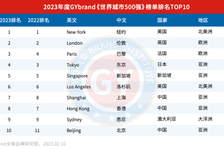 根据GYbrand独家发布的2023年全球城市500强榜单显示,世界十大城市排名依次是纽约、伦敦、巴黎、东京、新加坡、洛杉矶、上海、香港、悉尼、北京。